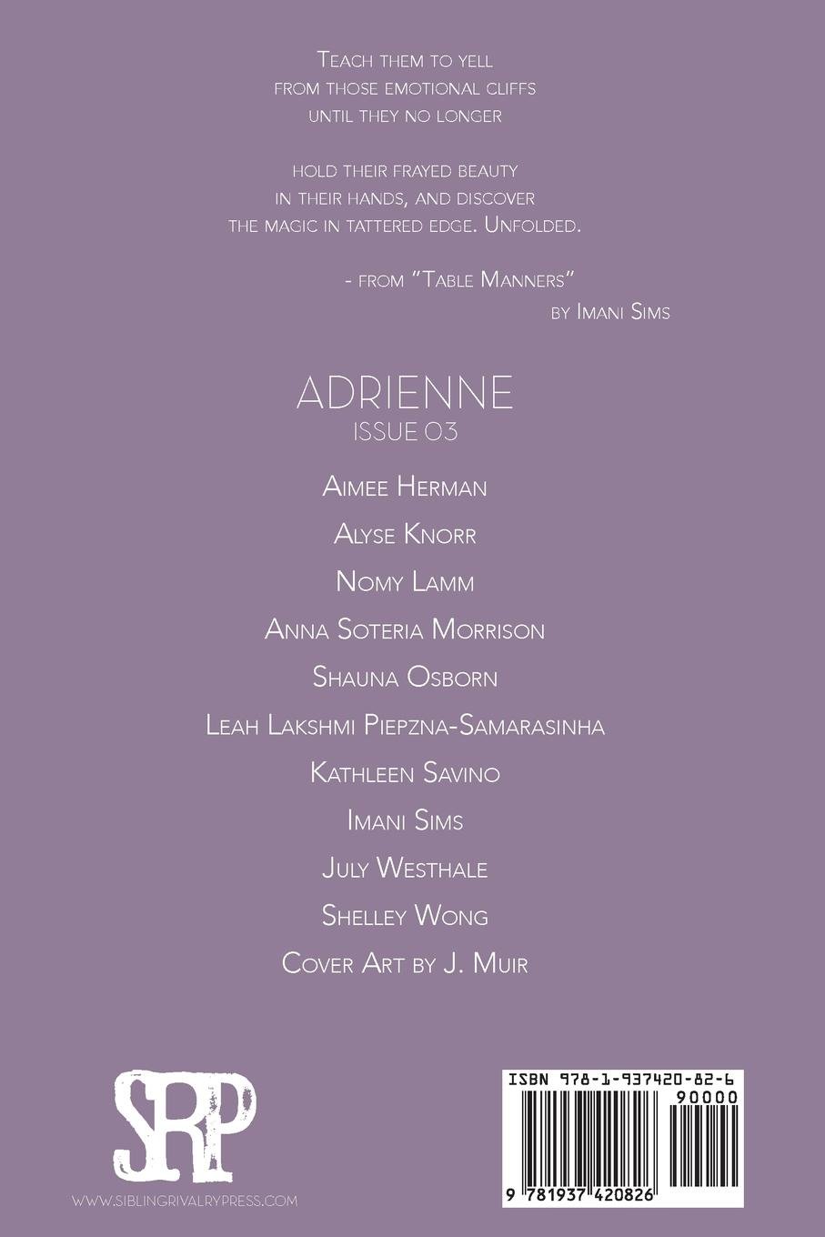 Issue 03 of Adrienne: A Poetry Journal of Queer Women (ISSN: 2331-9194) features a portfolio of work from established and emerging self-identified queer women poets. Included in this issue is a significant amount of work from Aimee Herman, Alyse Knorr, Nomy Lamm, Anna Soteria Morrison, Shauna Osborn, Leah Lakshmi Piepzna-Samarasinha, Kathleen Savino, Imani Sims, July Westhale, Shelley Wong, and cover artist J. Muir. Edited by Valerie Wetlaufer and proudly published by Sibling Rivalry Press.