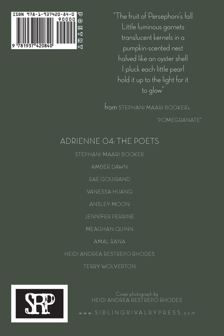Issue 04 of Adrienne: A Poetry Journal of Queer Women (ISBN: 978-1-937420-84-0; ISSN: 2159-0478) features individual portfolios of work by writers who self-identify as queer women. This issue features Stephani Maari Booker, Amber Dawn, Rae Gouirand, Vanessa Huang, Ansley Moon, Jennifer Perrine, Meaghan Quinn, Amal Rana, Heidi Andrea Restrepo Rhodes, and Terry Wolverton, with cover art by Heidi Andrea Restrepo Rhodes. Edited by Valerie Wetlaufer.