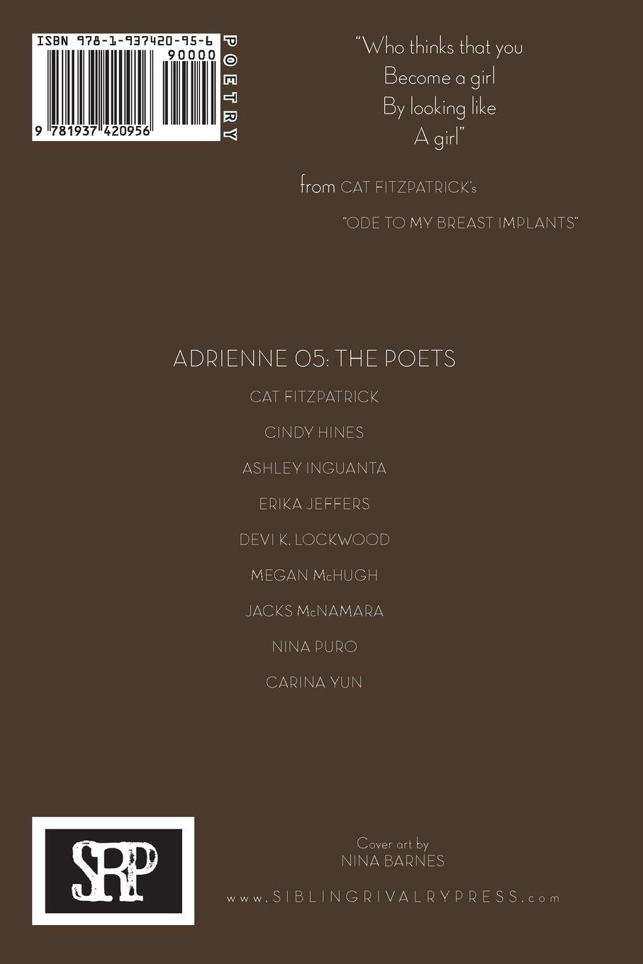 Issue 05 of Adrienne: A Poetry Journal of Queer Women (ISBN: 978-1-937420-95-6; ISSN: 2159-0478) features individual portfolios of work by writers who self-identify as queer women. This issue features Cat Fitzpatrick, Cindy Hines, Ashley Inguanta, Erika Jeffers, Devi K. Lockwood, Megan McHugh, Jacks McNamara, Nina Puro, and Carina Yun, with cover art by Nina Barnes. Edited by Valerie Wetlaufer and proudly published by Sibling Rivalry Press.
