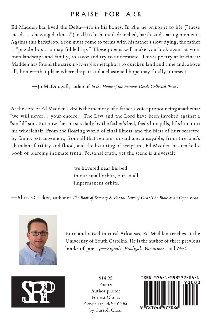 In a spring of floods, a son returns to rural Arkansas to help care for his dying father. <>b<>Ark is a book about family, about old wounds and new rituals, about the extraordinary importance of ordinary things at the end of life, about the gifts of healing to be found in the care of the dying. At once a memoir in verse about hospice care and a son’s book-length lament for his father, Ark is a book about the things that can be fixed, and those that can’t. Ed Madden is originally from Arkansas and is currently the Poet Laureate of Columbia, South Carolina. This book features cover art from Arkansas-born artist Carroll Cloar.