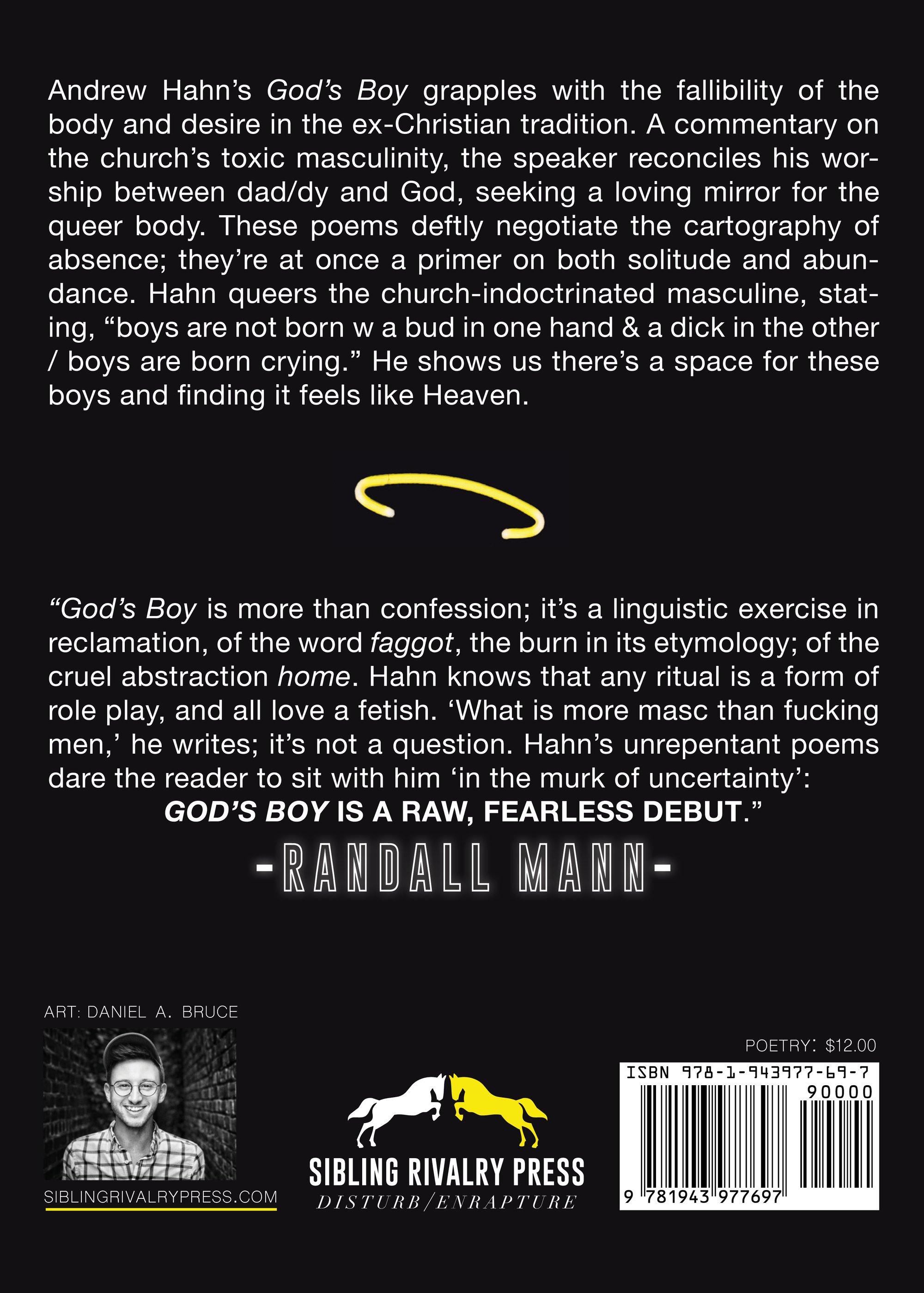 “God's Boy is more than confession; it’s a linguistic exercise in reclamation, of the word faggot, the burn in its etymology; of the cruel abstraction home. Hahn knows that any ritual is a form of role play, and all love a fetish. ‘What is more masc than fucking men,’ he writes; it’s not a question. Hahn’s unrepentant poems dare the reader to sit with him ‘in the murk of uncertainty’: God's Boy is a raw, fearless debut.” —Randall Mann