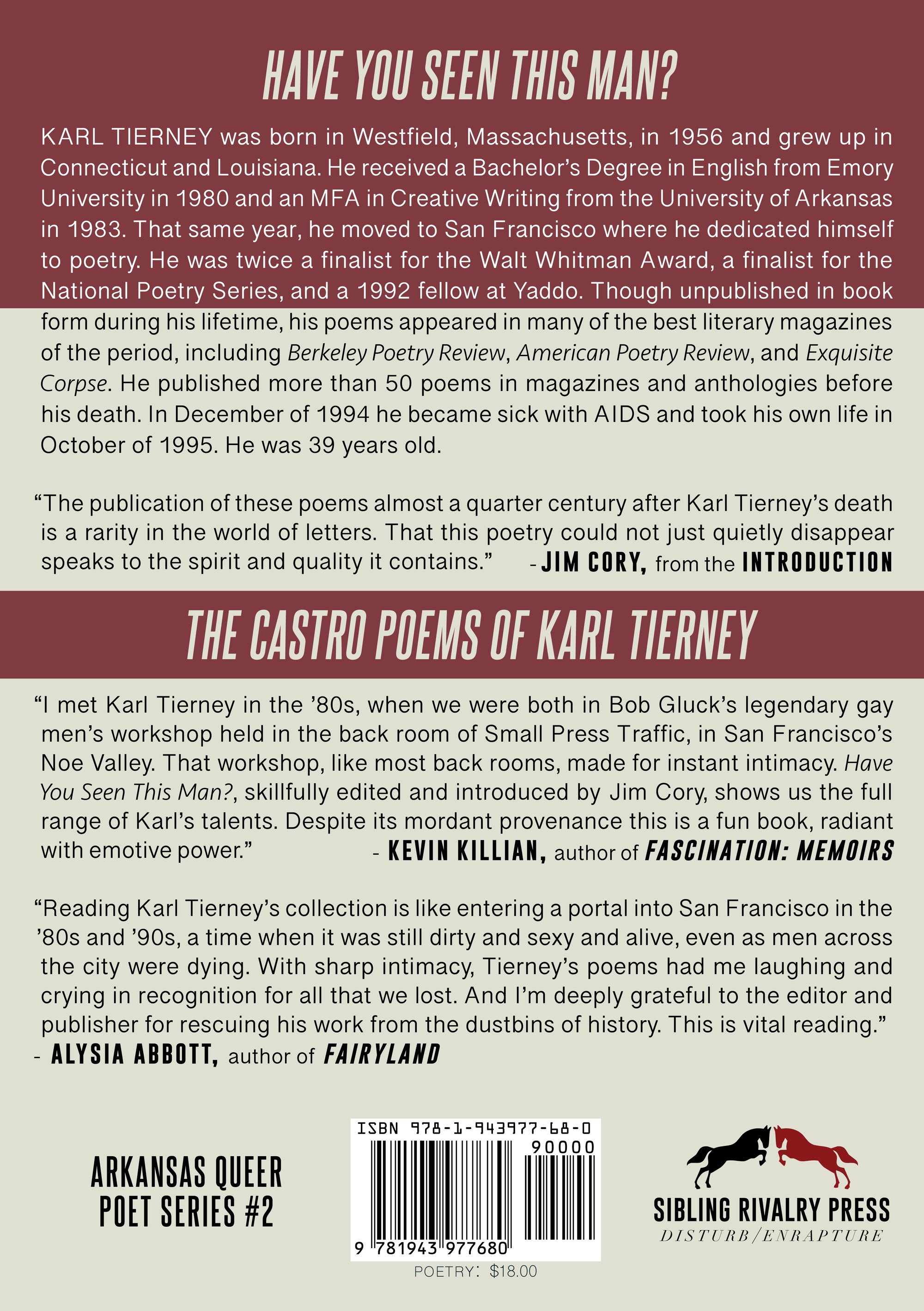 "I met Karl Tierney in the '80s, when we were both in Bob Gluck’s legendary gay men’s workshop held in the back room of Small Press Traffic in San Francisco’s Noe Valley. That workshop, like most back rooms, made for instant intimacy. Have You Seen This Man?, skillfully edited and introduced by Jim Cory, shows us the full range of Karl’s talents. Despite its mordant provenance this is a fun book, radiant with emotive power." - KEVIN KILLIAN