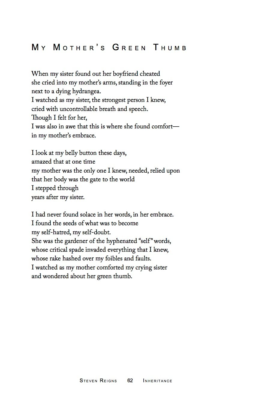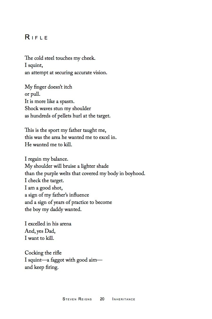 The autobiographical poems of Steven Reigns' INHERITANCE introduce us to the gains and losses of a true American family and detail the bequests of the shadows that linger. Reigns glosses over nothing to reveal what he has been given and the secrets that turn suburbia into a coming-of-age battlefield.