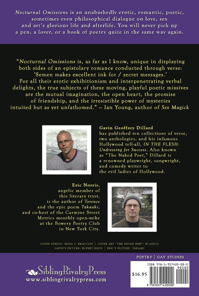 Nocturnal Omissions: A Tale of Two Poets - birthed through correspondence between authors Gavin Geoffrey Dillard and Eric Norris – is an unabashedly erotic, romantic, poetic, sometimes even philosophical dialogue on love, sex, and art’s glorious afterlife. You will never pick up a pen, a lover, or a book of poetry quite in the same way again.