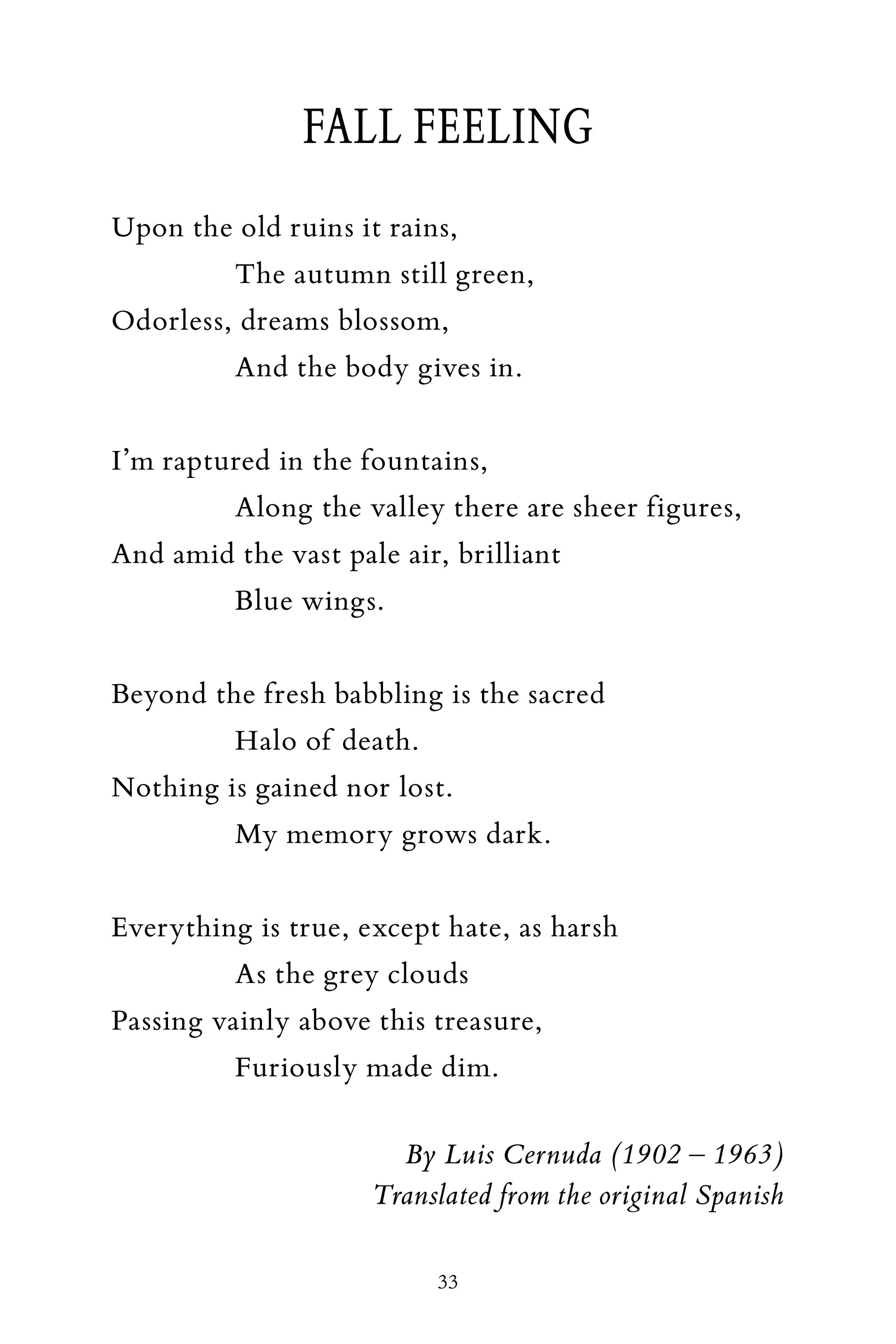 "In the resplendent Revelations, Ruben Quesada grants us a voice that feels both current and ancient. Continuous in its current of devotion, rich in its understanding of the ways we survive both beauty and difficulty, the soft-edged sharpness and sensuality of these poems feel seamlessly at home alongside several of Quesada’s elegant translations of the incomparable Luis Cernuda. ‘Already the jacarandas have started to push their tongues against the window,’ and we as readers are invited to inhabit that space between outside and in—where the best poetry conveys us.” — KHADIJAH QUEEN, author of I’m So Fine: A List of Famous Men & What I Had On