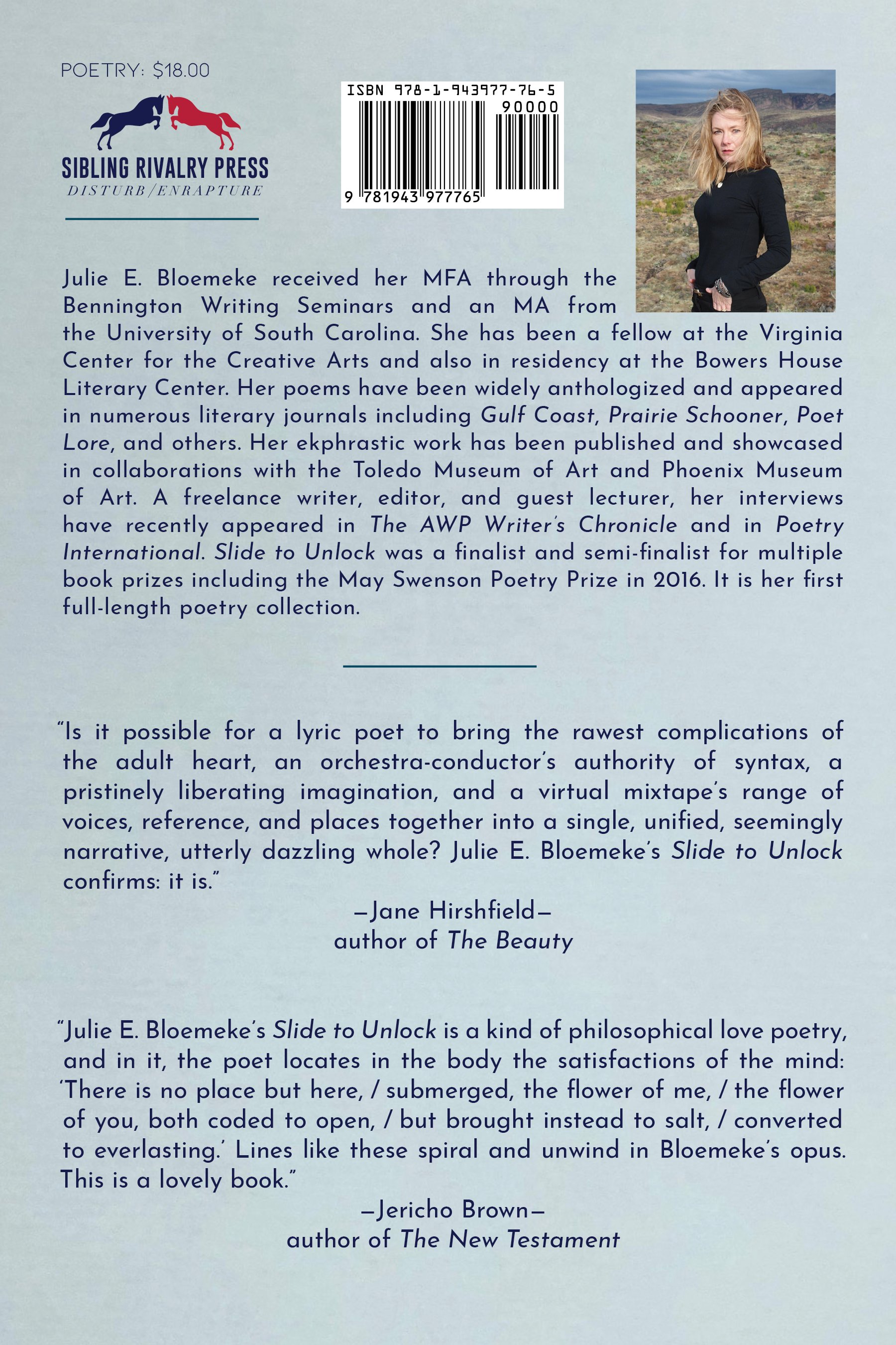 Julie E. Bloemeke received her MFA through the Bennington Writing Seminars and an MA from the University of South Carolina. She has been a fellow at the Virginia Center for the Creative Arts and also in residency at the Bowers House Literary Center. Her poems have been widely anthologized and appeared in numerous literary journals including Gulf Coast, Prairie Schooner, Poet Lore, and others. Her ekphrastic work has been published and showcased in collaborations with the Toledo Museum of Art and Phoenix Museum of Art. A freelance writer, editor, and guest lecturer, her interviews have recently appeared in The AWP Writer’s Chronicle and in Poetry International. Slide to Unlock was a finalist and semi-finalist for multiple book prizes including the May Swenson Poetry Prize in 2016. It is her first full-length poetry collection.