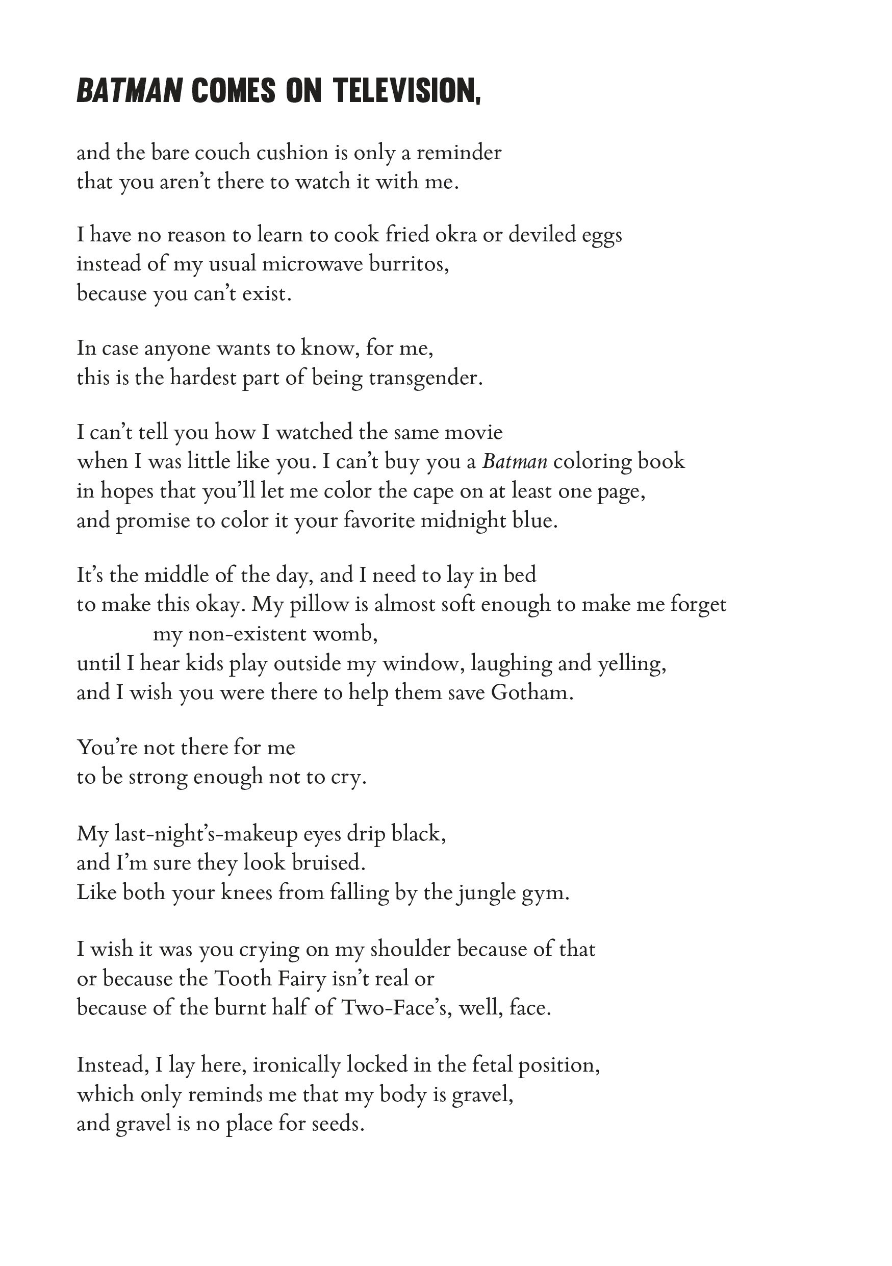 “Lilith Mae McFarlin’s So Long, and Thank You for All the Waterproof Mascara is a tour de force exploration of gender and sexuality—the artifice, the performative, and the genuine. These poems fearlessly punch back at our cruel political and cultural moment. In bold gestures, crisp imagery, and laugh-out-loud reversals that might make a reader’s mascara run, McFarlin invites us into her ‘penthouse level of unapologetic queerness.’”