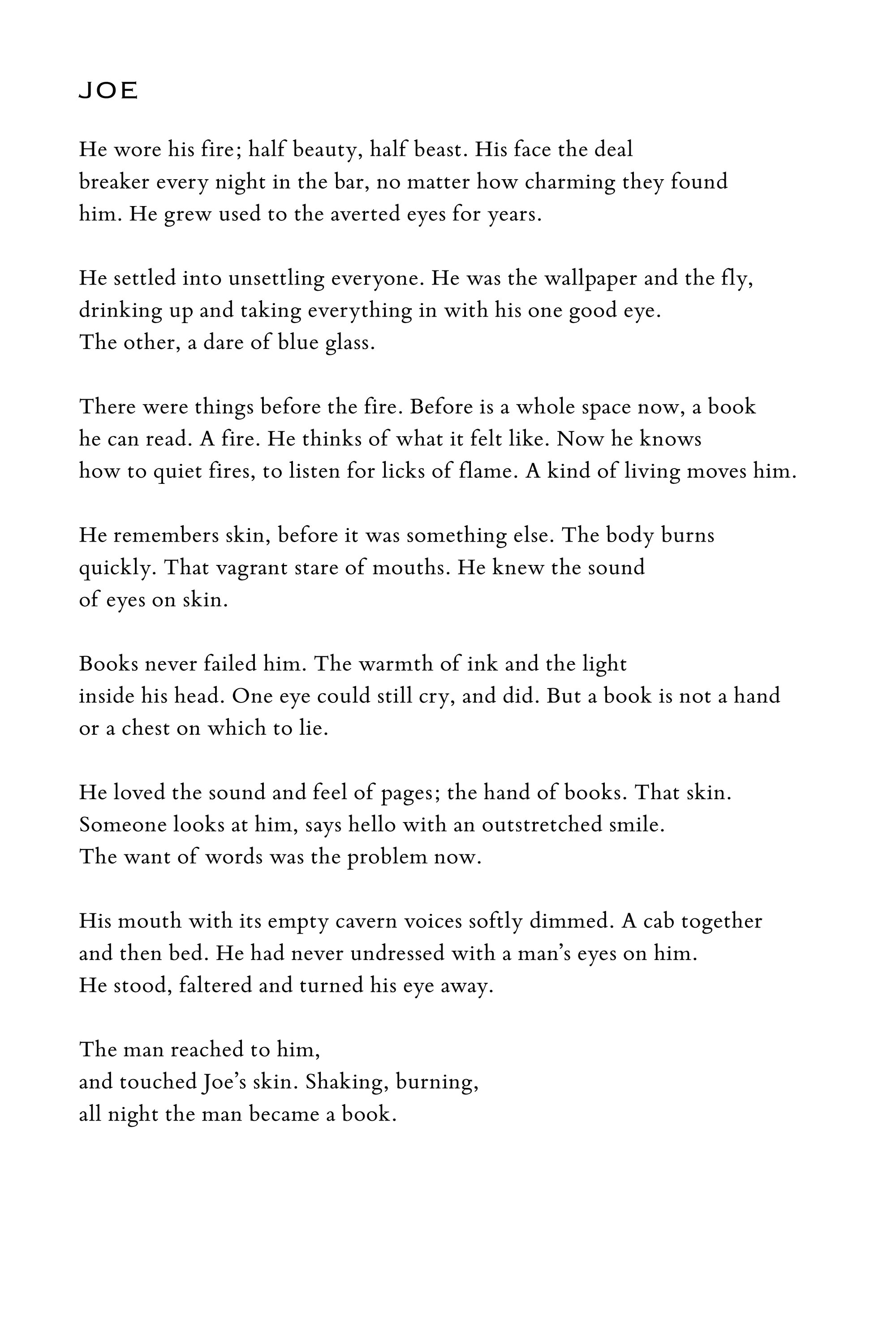 “Tender and lyrical, unflinching yet sensitive, this collection delves deep into the heart and its contradictions. Father figures and lovers, alluring strangers and lost friends: the men who figure in these finely crafted poems are at once emblematic and particular. With empathy and humor, Philip F. Clark’s work revels in lust and desire. He mourns the dead and celebrates the living, often circling back to literature’s sustaining power: all night the man became a book. He draws us towards what’s spoken and felt and what’s withheld and remembered, catching the human body, the carnal, in its elusive beauty: You stop my breath / as your beauty perfects // an exclamation point. / Your soul an ampersand.”