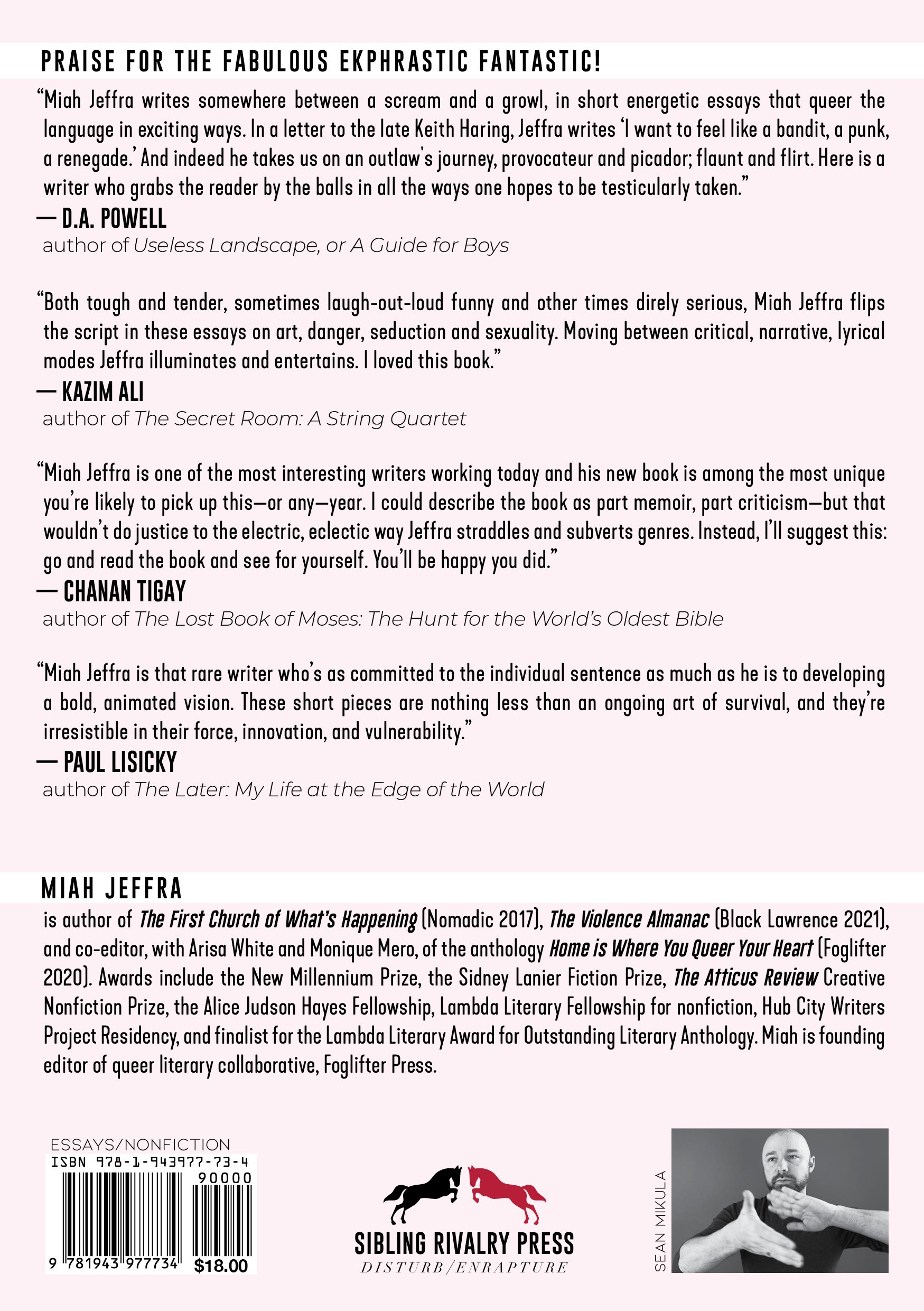 “Miah Jeffra writes somewhere between a scream and a growl, in short energetic essays that queer the language in exciting ways. In a letter to the late Keith Haring, Jeffra writes ‘I want to feel like a bandit, a punk, a renegade.’ And indeed he takes us on an outlaw's journey, provocateur and picador; flaunt and flirt. Here is a writer who grabs the reader by the balls in all the ways one hopes to be testicularly taken.”