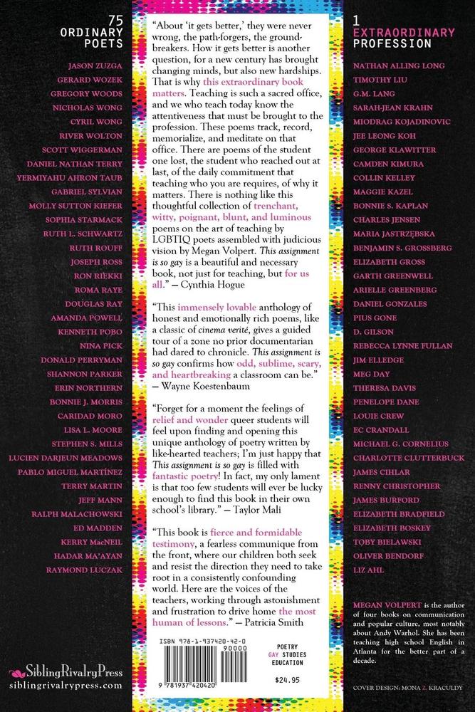 This assignment is so gay: LGBTIQ Poets on the Art of Teaching is the first-ever anthology to feature an international roster of lesbian, gay, bisexual, trans, intersex and questioning poets writing about and from the teacher's perspective. All the pieces in this collection engage some aspect of teaching, but many are not explicitly queer-themed.