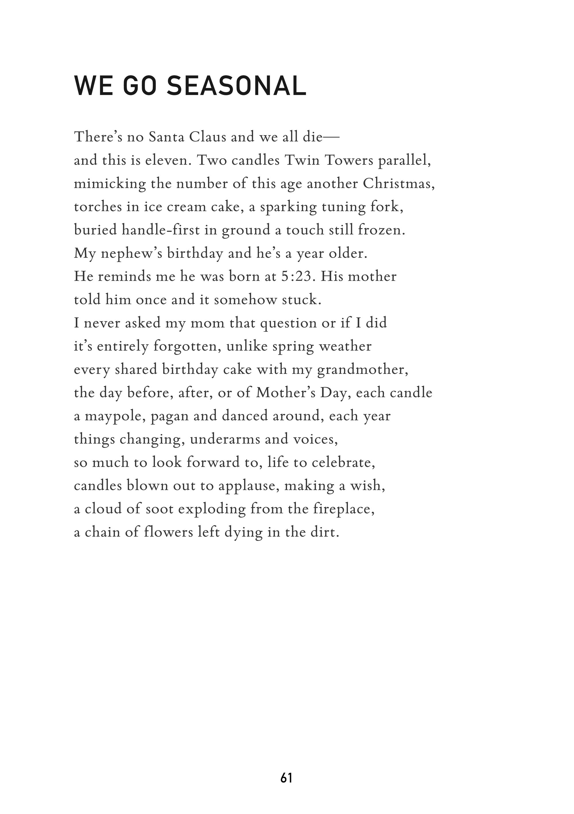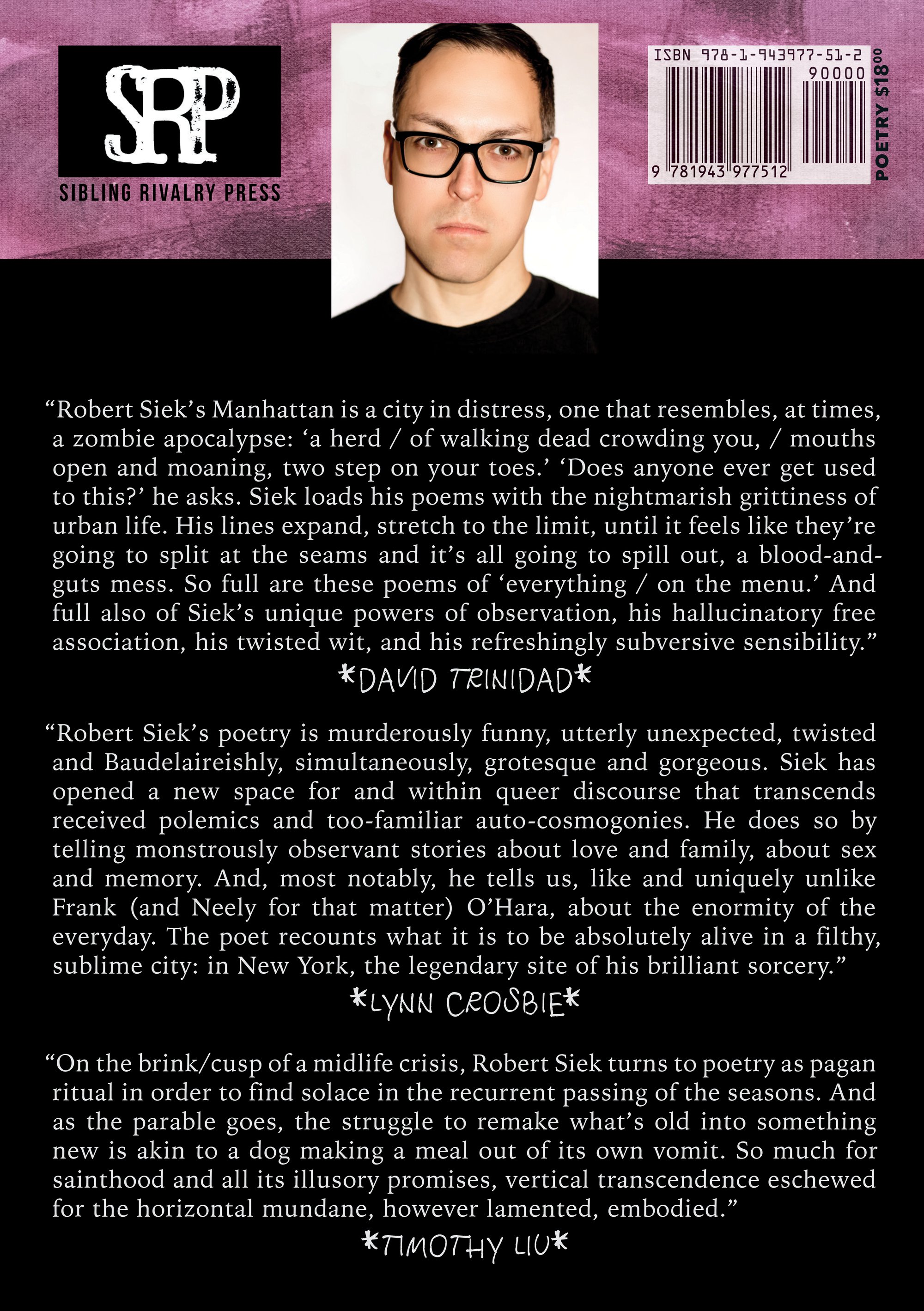 “On the brink/cusp of a midlife crisis, Robert Siek turns to poetry as pagan ritual in order to find solace in the recurrent passing of the seasons. And as the parable goes, the struggle to remake what’s old into something new is akin to a dog making a meal out of its own vomit. So much for sainthood and all its illusory promises, vertical transcendence eschewed for the horizontal mundane, however lamented, embodied.” - Timothy Liu